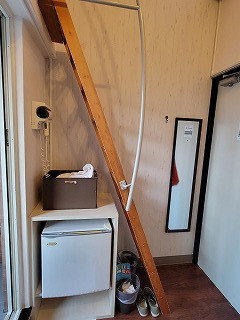 その下にはドライヤー・ミニ冷蔵庫・アメニティ・スリッパ、デスクにはコップ類など備品も用意されています。