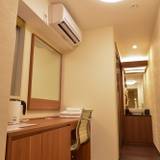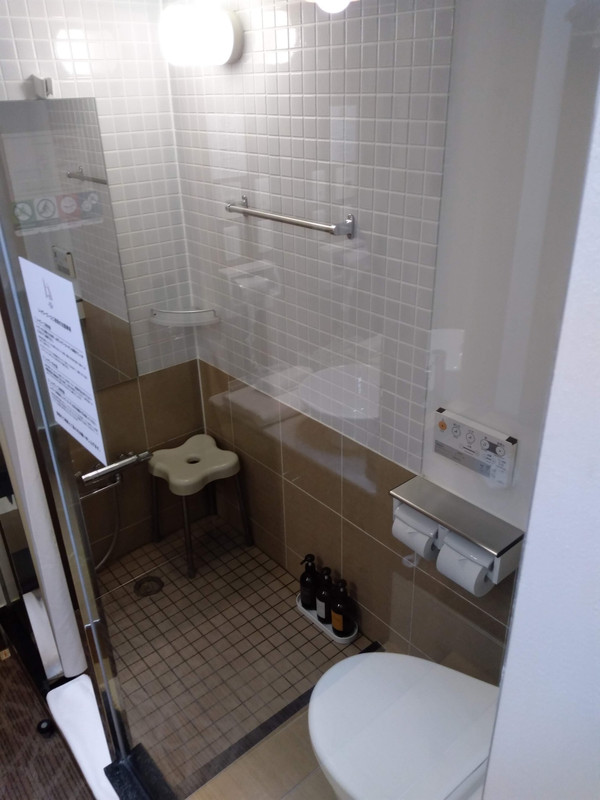狭いが寝るだけの旅には問題なし。シャワー室の椅子がありがたかった。