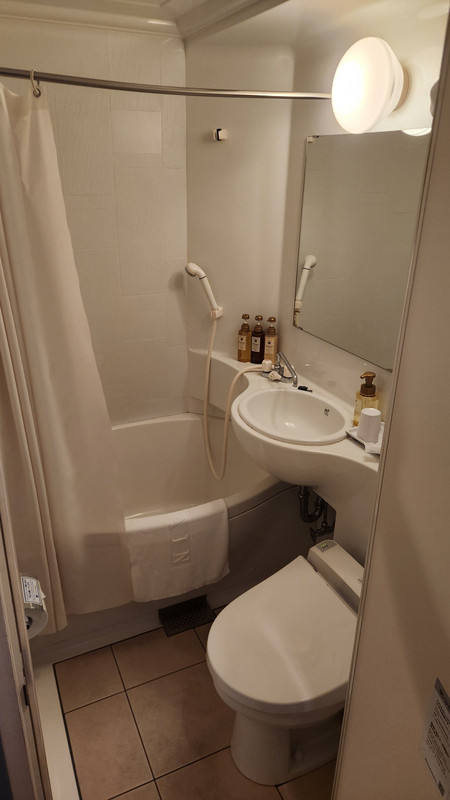 八丁堀から少し北に歩いたところにあるビジネスホテル。安めなだけあって部屋は少し狭目でシンプルな作り。壁等少し傷んでいるところもありましたがそこまで古い訳でもありません。宿泊するだけであれば特に問題はないかと思いますが、部屋でのんびりしたり机に向かってパソコンで仕事をするほど感じの部屋でもありません。バスルームも狭目。形的にはアパホテルのバスルームと同様の形かと。