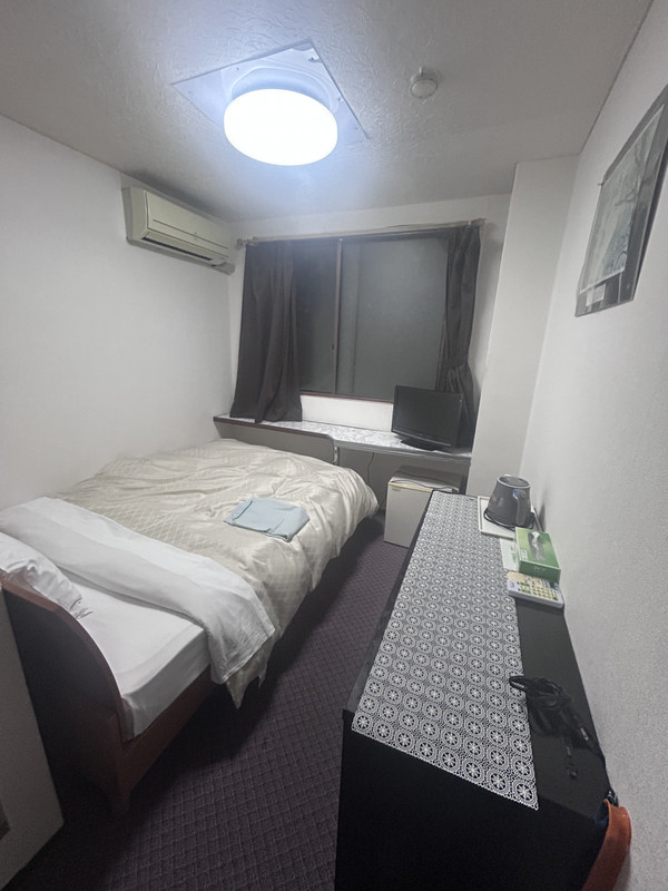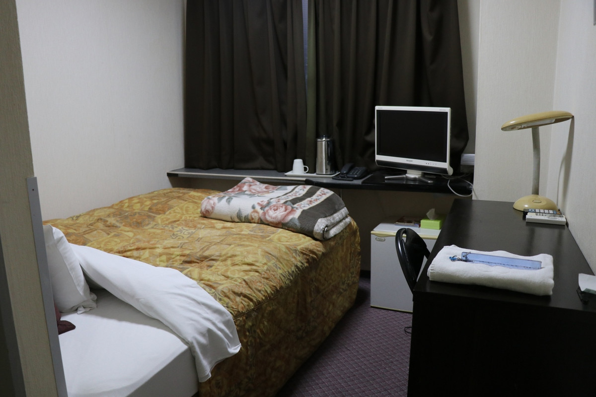 枕が高すぎるのと、室外機がうるさく、目の前が国道で夜通し音が途切れないことは難点ですが、県庁所在地で個室1泊3500円はもう化石のようなありがたみです。1 / 2