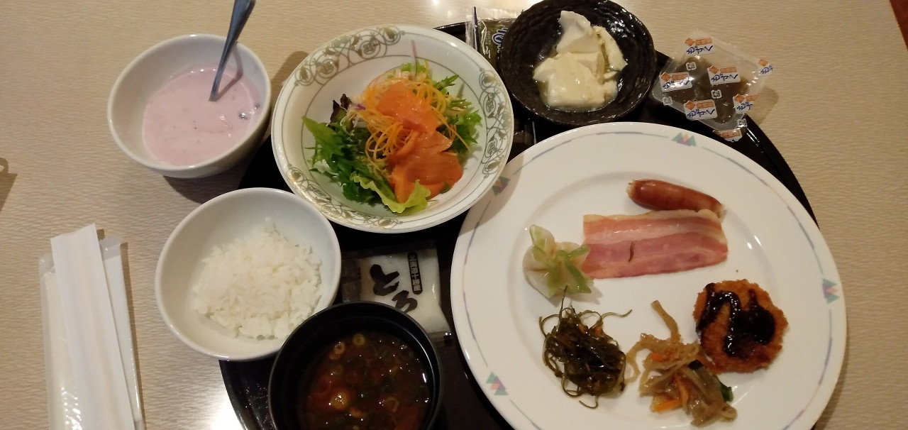バブル期完成の建物だけあって客室は広く調度も良い仕様です。浴室でTV音声が聞けるスピーカー、なんて懐かし設備も実装されてました。朝食ビュッフェは品数より質を求めた感じが伺えます。味噌カツ・きしめん・お味噌汁は赤だしっと地元グルメもありました。