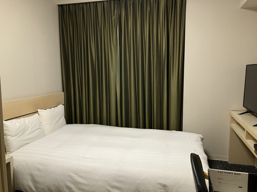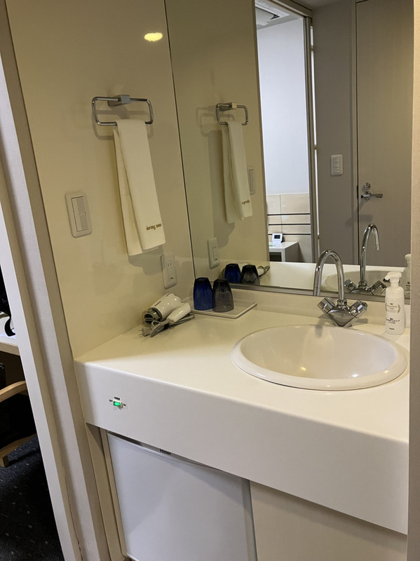 お部屋は若干年期が入っていますが、よく清掃されており清潔感がありますので満足です。間取りはドーミーインの一般的な間取りで、お部屋に入ると洗面台と2枚扉があり、片方がリビング、もう片方がバストイレになっています。