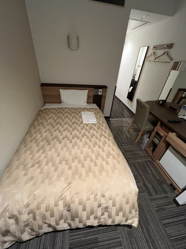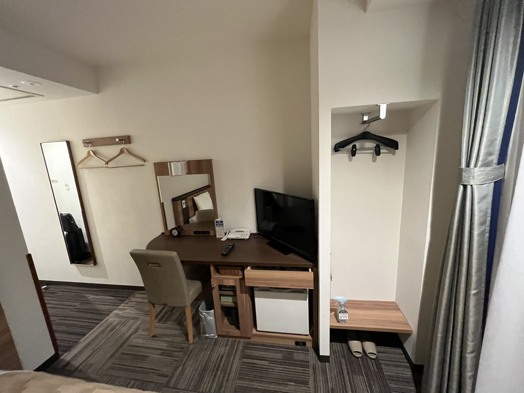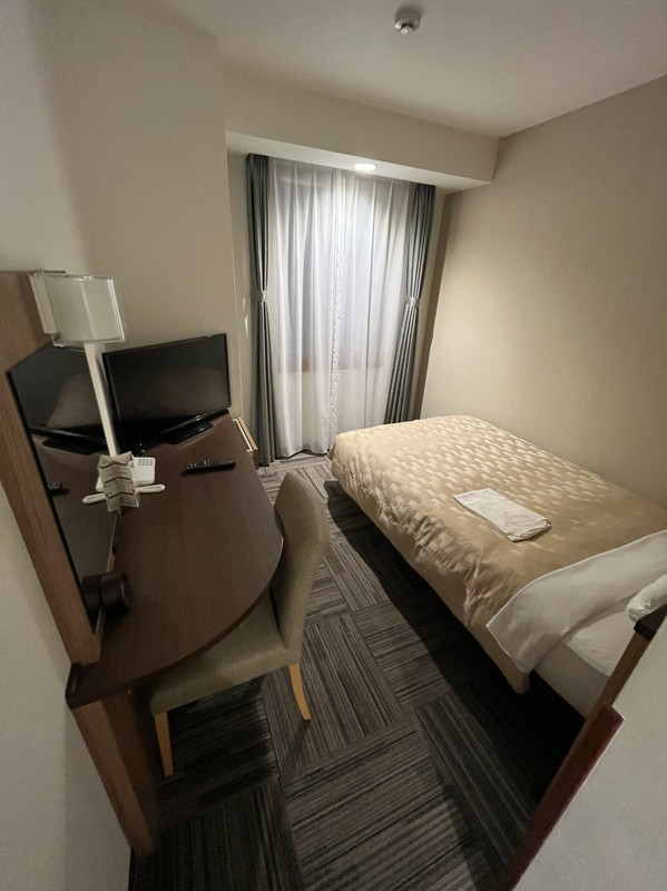 かつて名古屋出張の時に常宿にしていた場所ですが、今回は観光で宿泊しました。栄のど真ん中ですが、宿泊費が比較的リーズナブルで、今回は1泊4000円でした。コンビニもホテルの近くにあります。部屋には冷蔵庫は、カップアイスが入るくらいのスペースがありました。