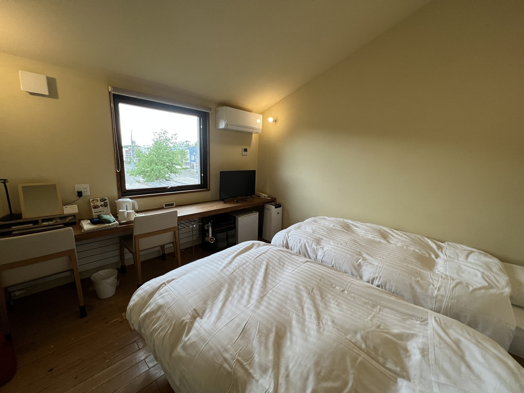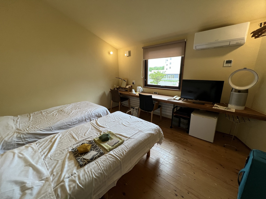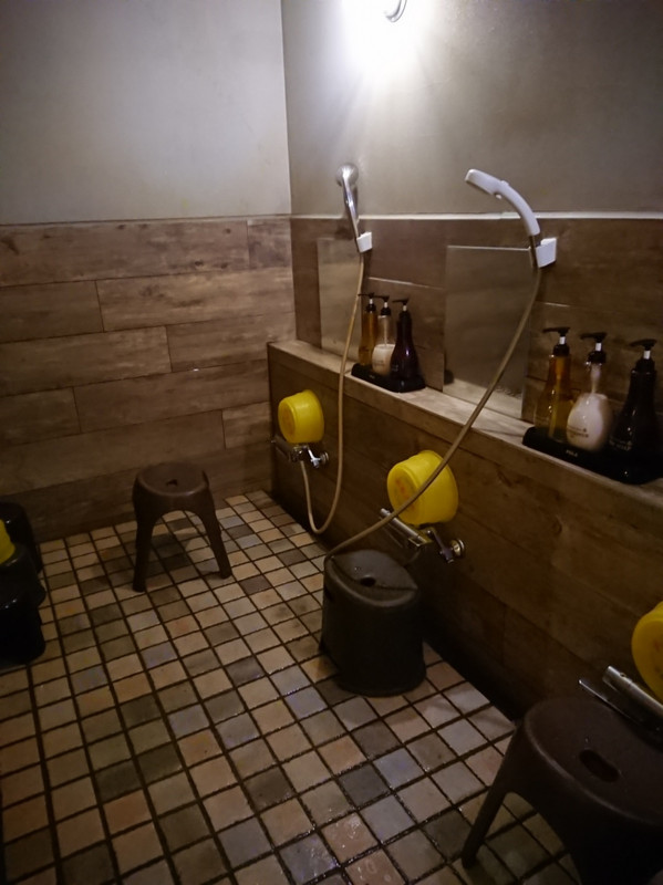 お部屋は、ツイン。ビジネスホテル並みの狭さで、トイレも洗面もなし。まずは、温泉!と行ってみたら、洗い場も仕切りのない4つのみで、浴槽も小さく、露天も解放感がない作りになっています。泉質は素晴らしいですが、スペースの狭さから長居できない雰囲気。IKEAの小物も多用されていて、センスよくまとめています。