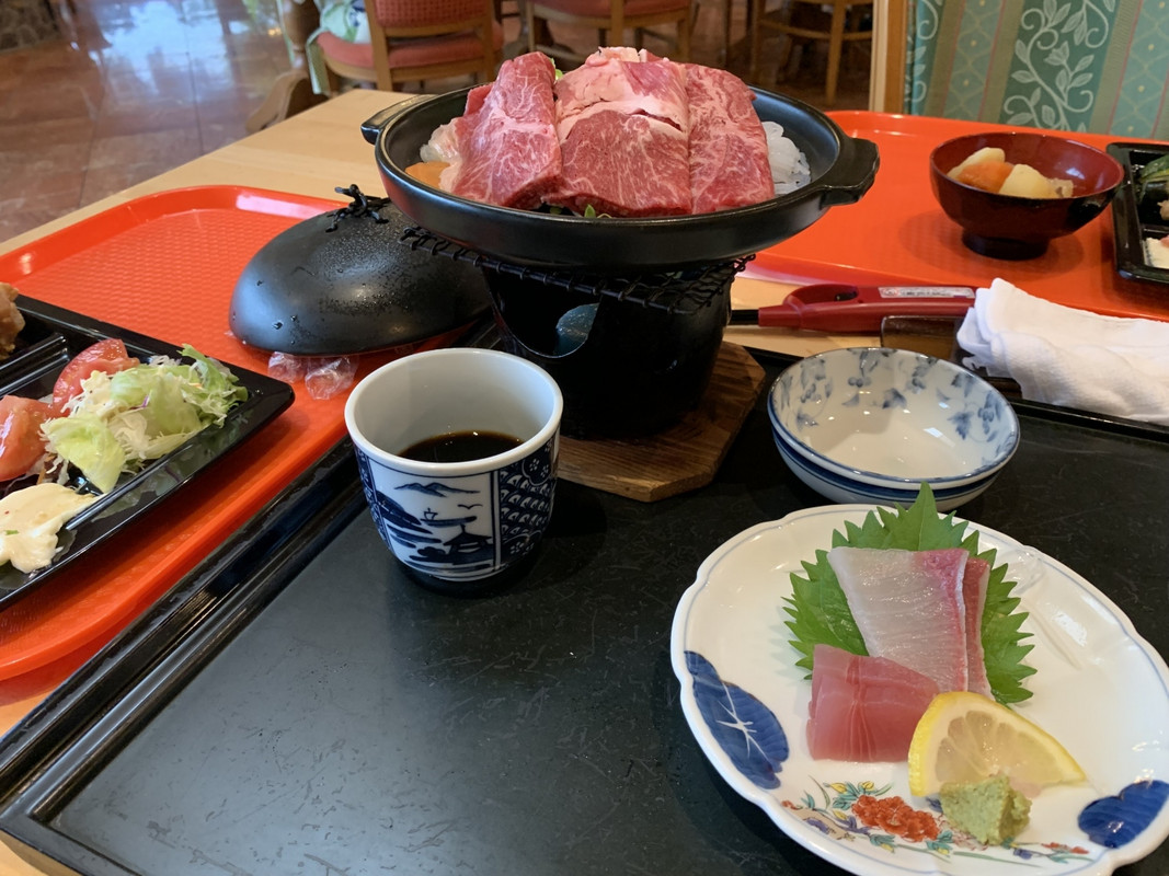 夕食は、阿蘇赤牛のすき焼きとハーフバイキングを選択しましたが、ハーフバイキングにしてもメニューが少なすぎです。メインのスキ焼きのお肉は硬くうま味も期待していた程ではありませんでした。朝食ブュッフェは平均的かと思います。