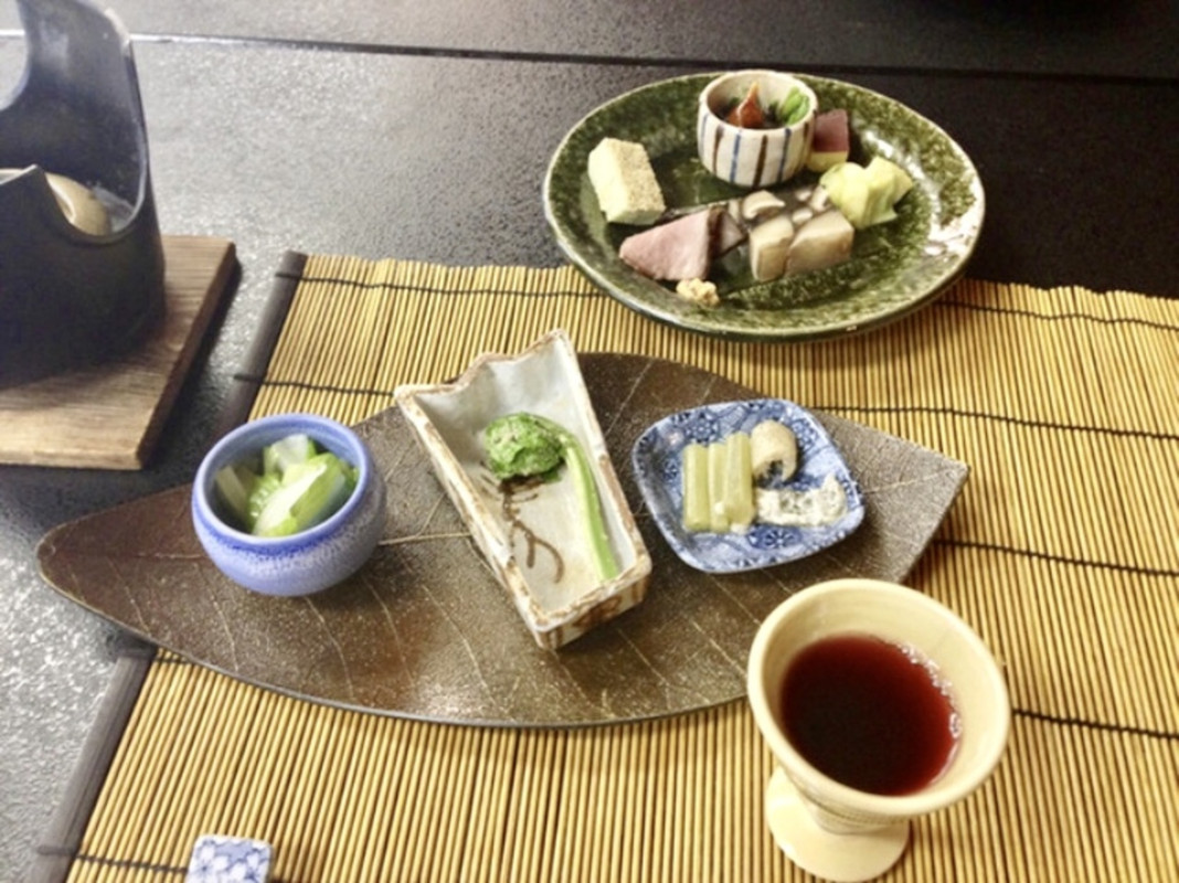 夕食で頂いた「はづ別館」の地元の旬の食材にこだわったと云う会席料理は、「秋・紅色」と題され、予め用意されていたお膳には、食前酒の柚子酒、先付の落花生豆腐、秋茄子田舎煮、かしわ牛蒡焚き、造里の川魚刺身でした。