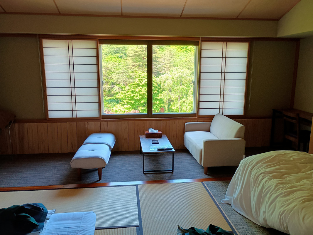 部屋はベッド2つに畳の上に布団という余裕のある面積だったので、家族三人でもゆったり過ごせた。1 / 2