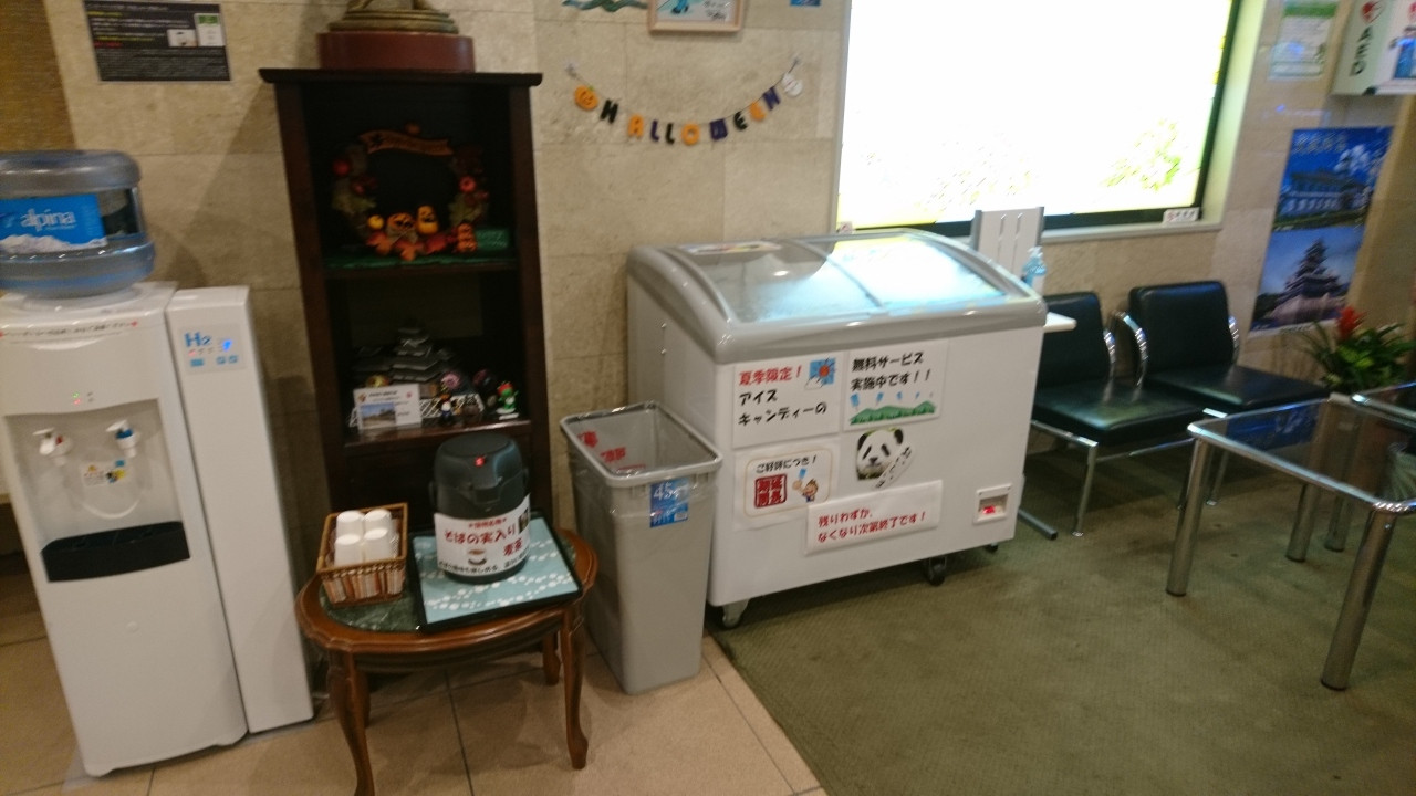 松本空港からバスで市内に入ったのですが、このホテルのすぐ向かいにバス停がありました。(しかし、知らずに駅まで行き戻ることに)ホテルは、少し引っ込んだところにありますが、看板があるのでわかると思います。フロントは2階です。安いプランにしたので古い方の建物でした。これが、まずまず古いです。当然、部屋も古いです。中は、広くゆったりとしています。このホテルには、あまり広くない大浴場があり、旅の疲れを癒してくれました。そして、宿泊者にはアイスキャンディがいただけ、お風呂上りにいただきました。とても、おいしいアイスキャンディでした。