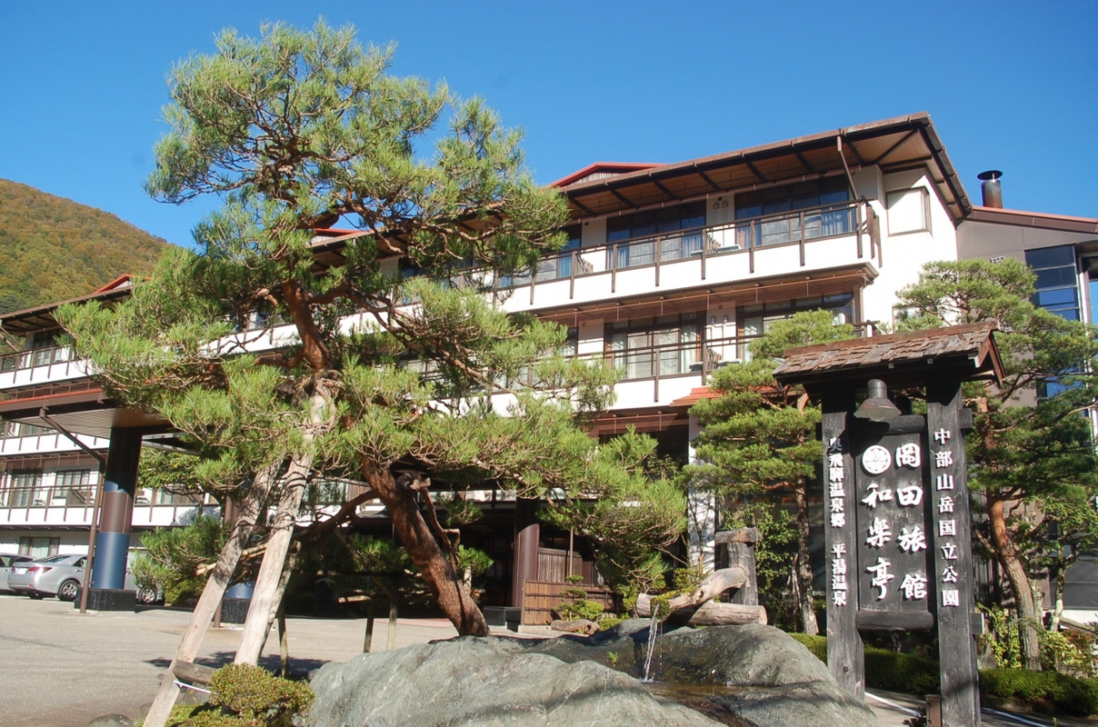 平湯温泉街の中心にある5階建て(地上4階・地下1階)の老舗(1921年開業)。本館(60室)と和楽亭(10室)と称する古民家風の離れがある。平湯バスターミナルからは 350mほど。