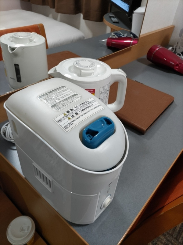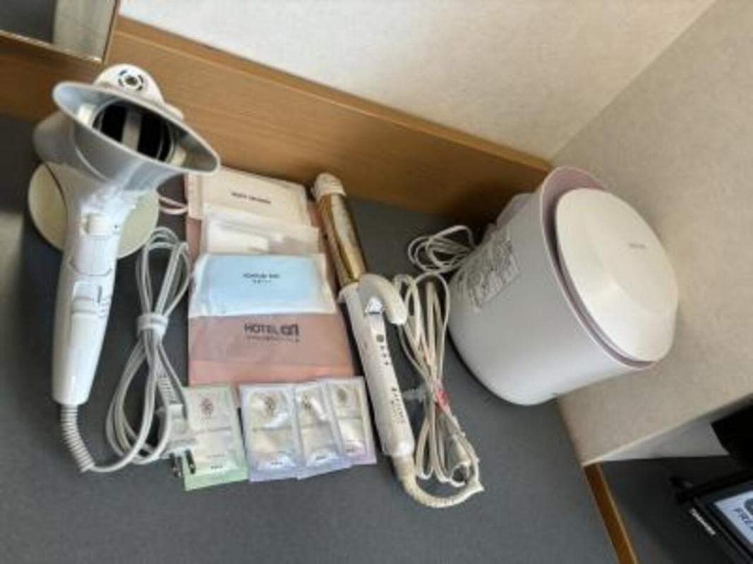 部屋にはイオンスチーマー・カール&ストレートアイロン・マイナスイオンドライヤーが準備され、チェックイン時にクレンジングや化粧水のセットが貰えましたが、アメニティは1Fロビーに設置されていて自由に選ぶこともできました。