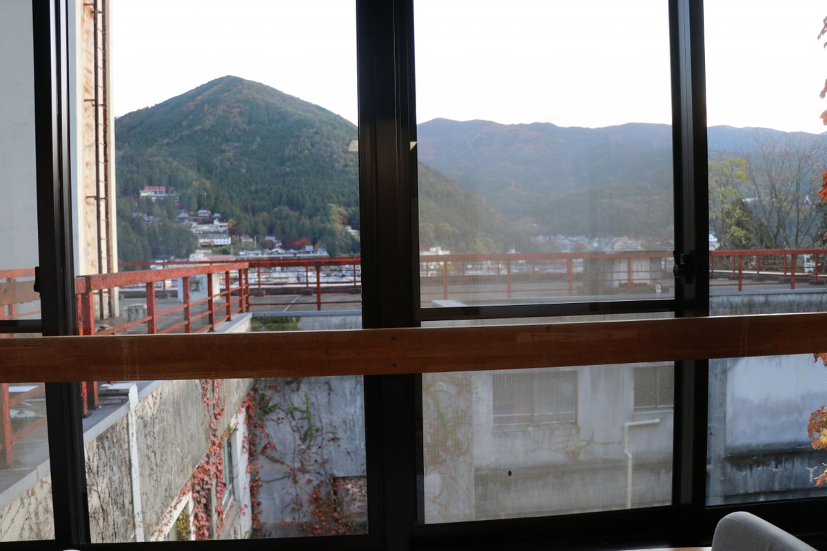 部屋からの眺望はなかったのですが、共有スペースのテラスからは下呂を一望できました。