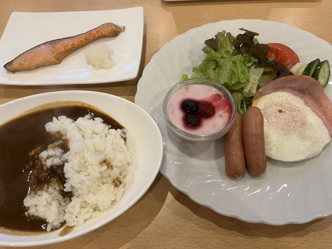 7:00~スタートで遅めでした。定食でしたが、カレー付いてて満足しました。ドリンクはお茶とコーヒーでした