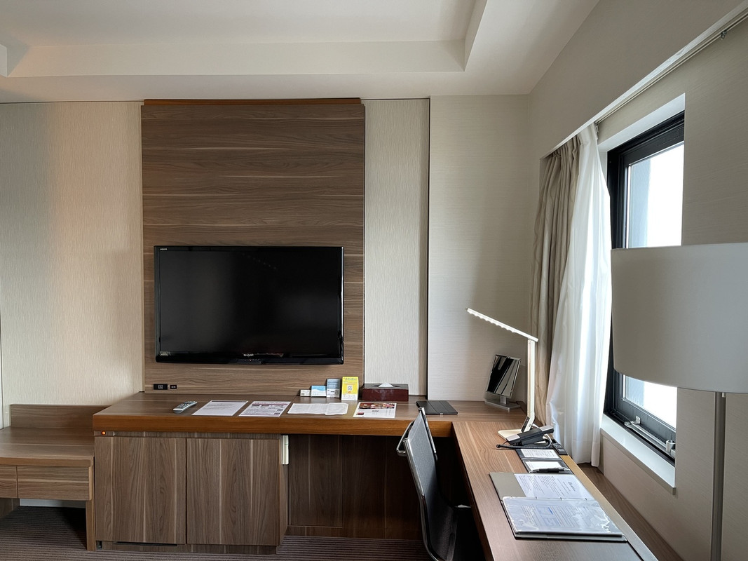新潟駅の駅ビルCoCoLo西館に入っているホテルで、駅から連絡通路を歩いて行くと簡単にフロントにアクセスできる。フロント入り口手前にはセブンイレブン、入り口先には日本酒とかつまみを扱うぽんしゅ館があって、買い物至便。フロント横にはちょっとしたラウンジスペースがあって、コーヒー、紅茶がサービスされている。