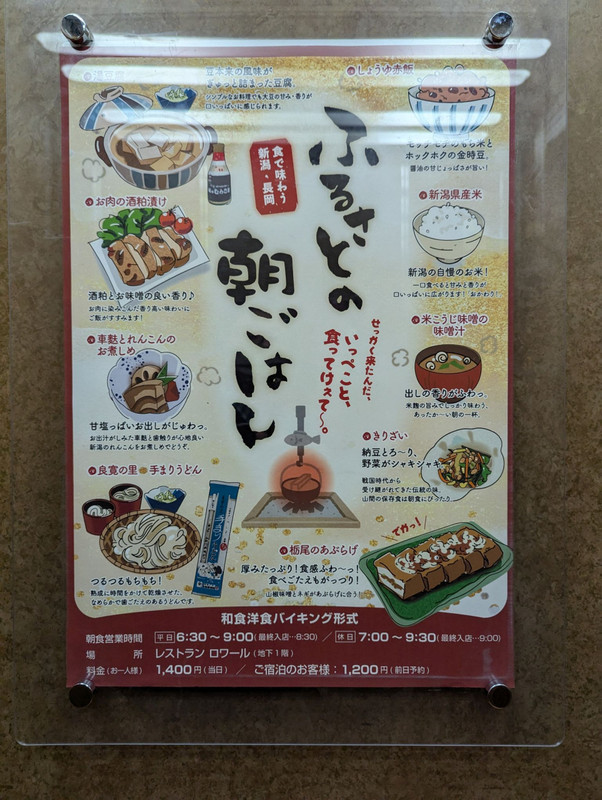 朝食はビュッフェ方式で地元の料理も提供されており、自分は栃尾のお揚げがおいしかったです。