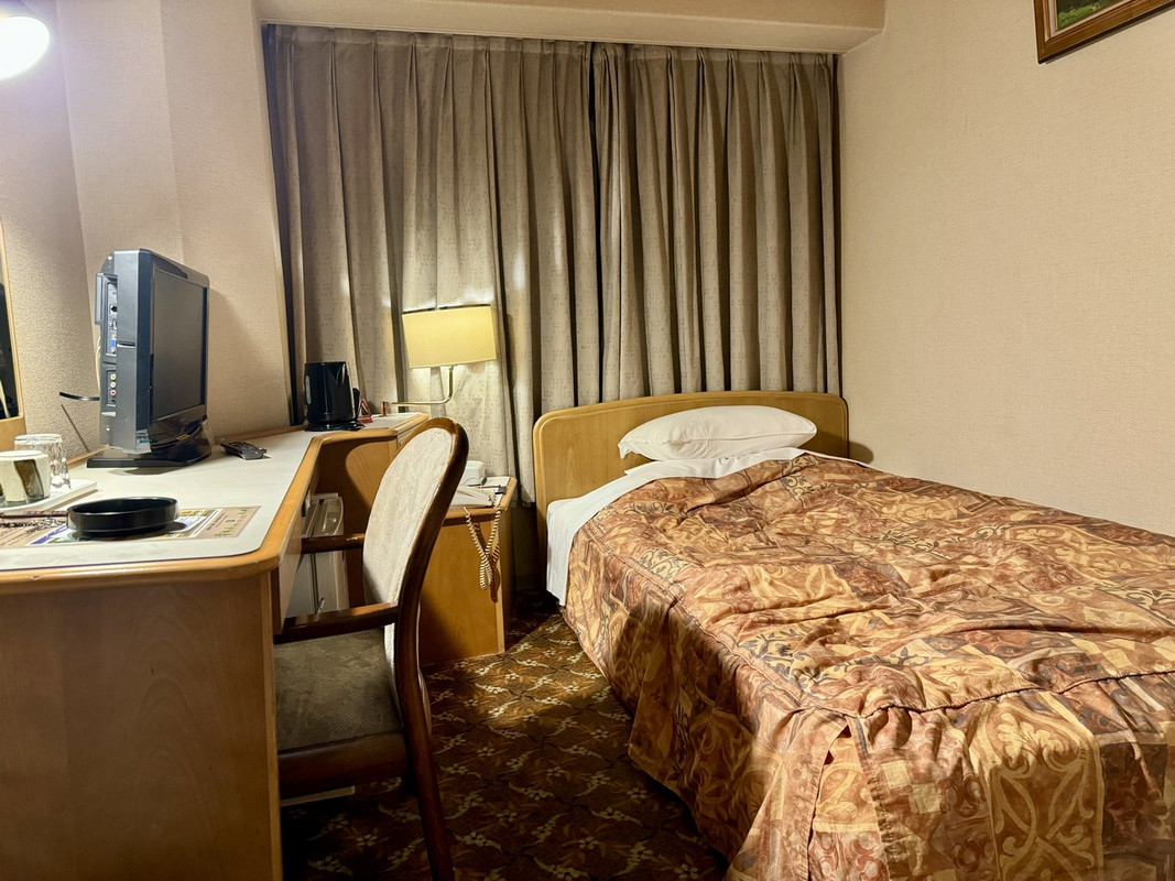 造作や設備はやや古さを感じるものの、ツインルームは2方向に窓があり明るい室内でした。7月の3連休中、1人4,000円で宿泊できたのでコスパはまずまず。