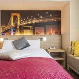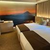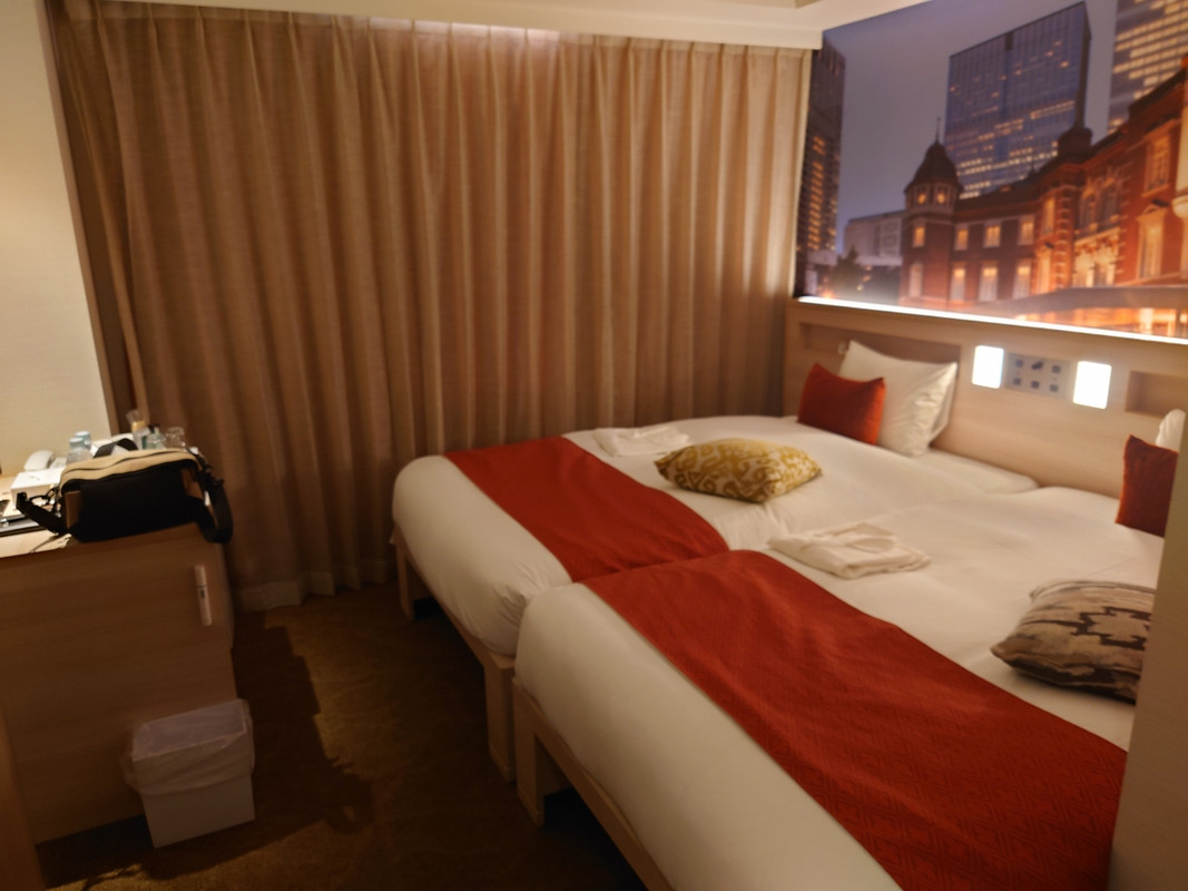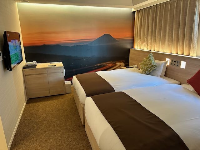 以前から宿泊してみたくて営業が再開したので、はじめまして宿泊してみました。デラックスツインは25㎡でコンパクトながらバストイレ独立で浴槽もゆったりしていてリラックスできます!洗面台も使いやすく、ベッドはデュベスタイルのシモンズで寝やすく、加湿空気清浄機、コーヒーにミネラルウォーター、1階ラウンジでソフトドリンクのサービスに電子レンジがあり便利でよかったですね。部屋は8階最上階の通り側でしたが静かで、ホテルもワンフロア15室で100室強のホテルなので落ち着いて滞在できました。ユニークな壁のアクセントは好きな夕陽の富士山で綺麗でよかったですね!アクセスは羽田空港への送迎のバスもあり空港利用時は良いですね!