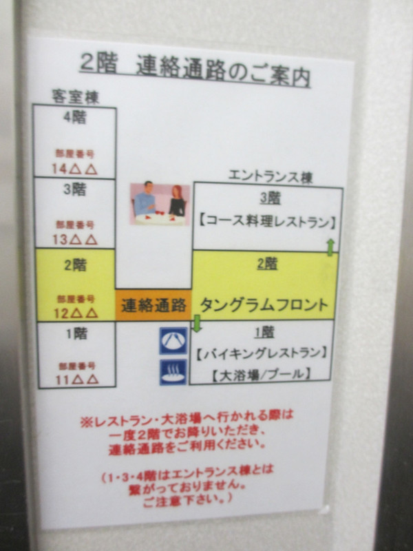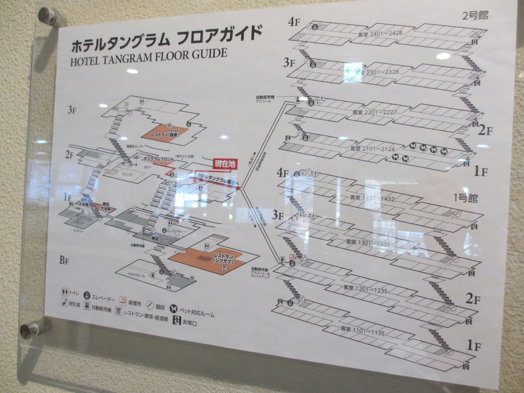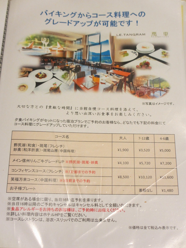 タングラムと名の入ったピアノまで置かれている。宿泊した部屋は一人では広すぎるくらいで、リッチな山岳リゾート気分に浸れる。洗面台が二か所、オープンキッチンカウンターまであるから、長期滞在にも向いている。部屋のお風呂もよいが、大浴場で入ったほうが気分的にもゆったりできる。食事は広いレストランで。夕食・朝食はブッフェ式、感染予防対策も