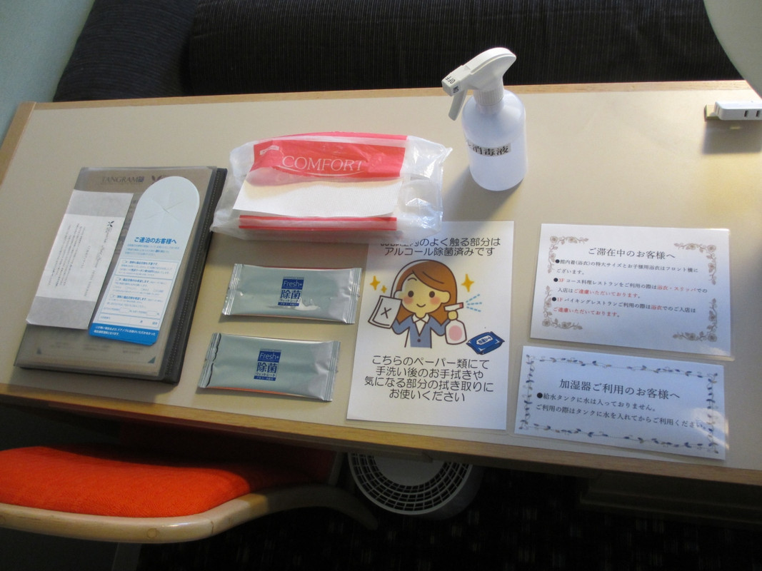 カウンター上に感染予防対策の消毒スプレーや除菌シートあり