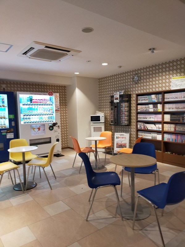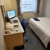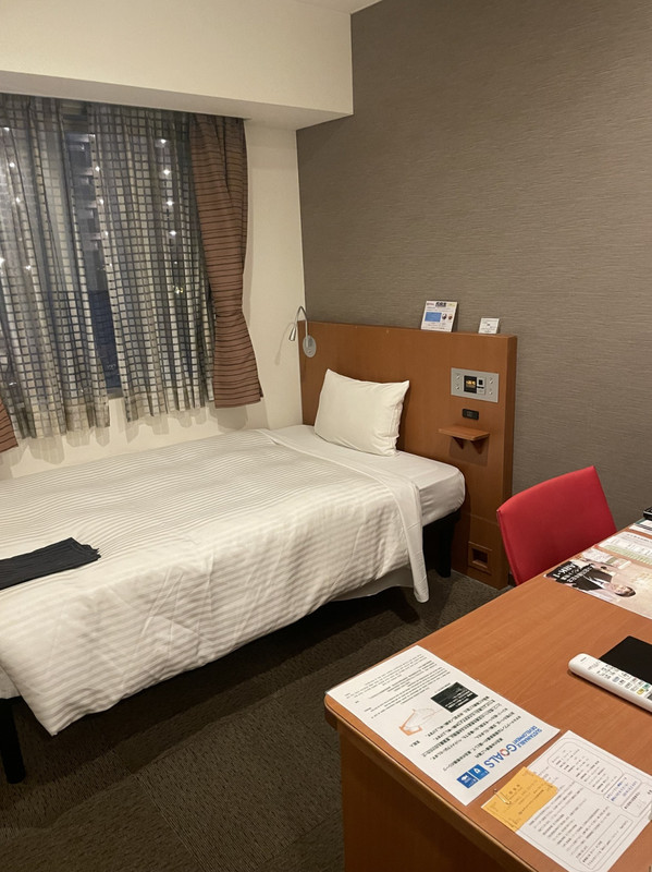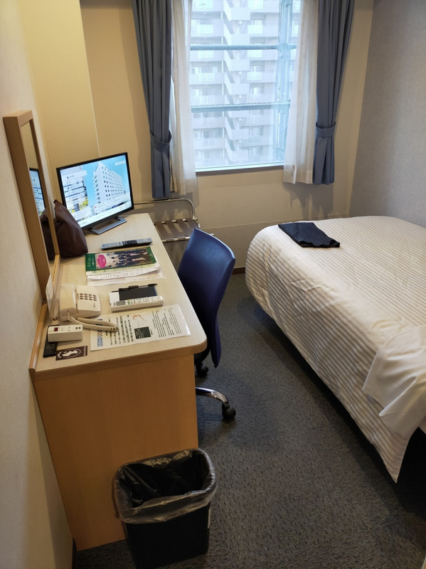 高層階ですが 今は 工事中で 景色が いい 遮られている状態です。折りたたみ式のスーツ置き場があります。 テレビは小さめです。 建物も少々 古いと思います が 掃除 はちゃんとして ありました。 冷暖房は普通のエアコンです。 コンセントは枕元に1つ デスクに 2つ バスルームに1つです。 フロント 近くに 色々なアメニティグッズが置いて ありました。 ここのホテルの良い点は 2階に大浴場があることです。 洗い場は4つですが 浴槽は ビジネスホテルとしてはまあまあの広さです。 駅から 近くて 歩いて 3分ぐらいです。 近くに大きなショッピングモールがあるので 便利です。1 / 3