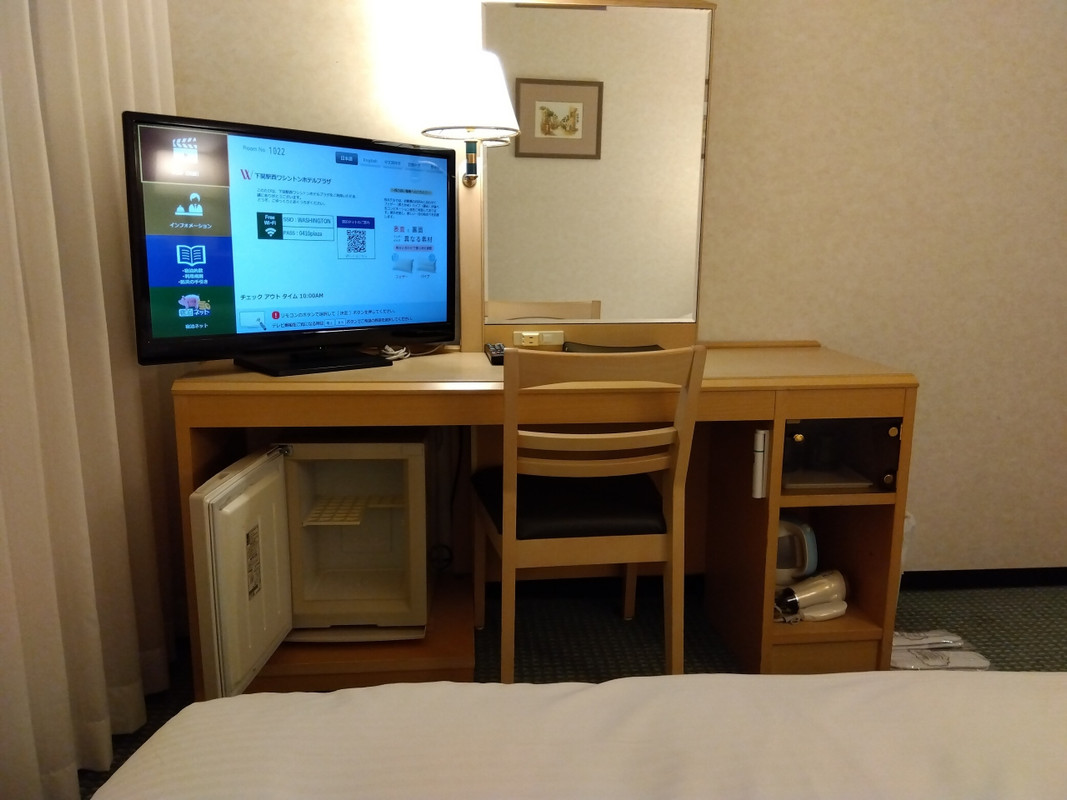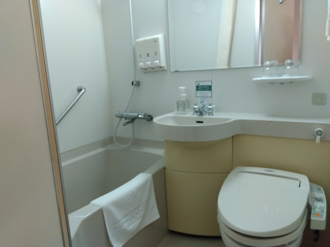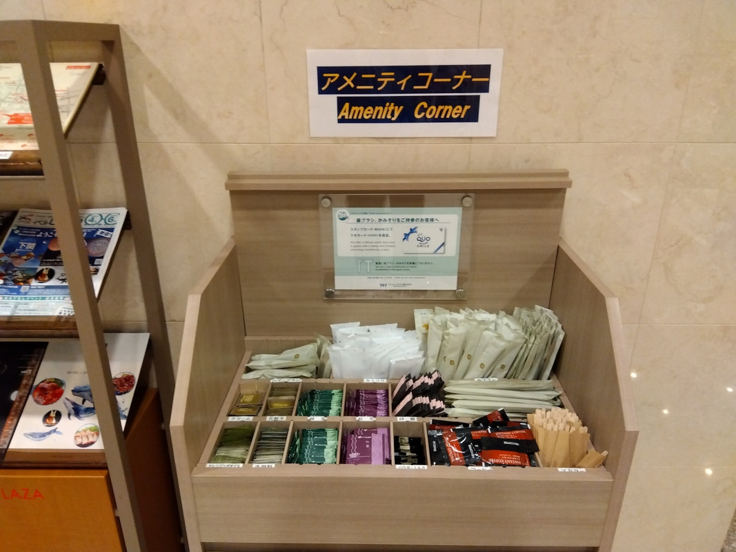 プラザホテル下関とは全く別。全国のワシントンホテルプラザとR&Bホテル共通のエコポイントカードがあり、歯ブラシ・剃刀を自分で準備していると1泊1スタンプもらえる。5つでQUOカード500円分と交換らしい。最後のスタンプから1年がポイントの有効期限。その他必要なアメニティはフロント前でピックアップ。