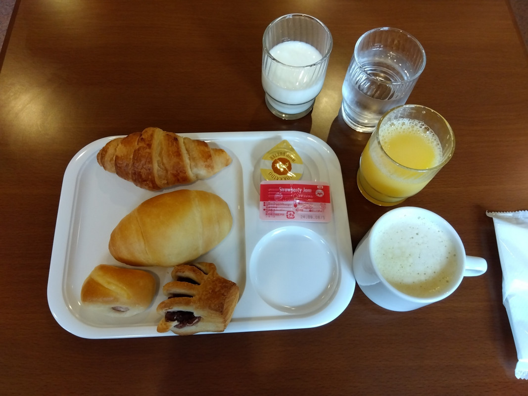 メニュー内容的にはとても簡単で、パン4種 (たけのこ肉まんパイ?、明太子ポテト、ロールパン、クロワッサン)、スープ3種 (コーン、ビーフコンソメ、クリームチャウダー)、味付けゆでたまご、野菜ジュース、オレンジジュース、ミルク、そしてコーヒー・紅茶 (ダージリンとアールグレイ)。パンは具が斬新で私は好印象を受ける。が、具はかなり少ない…!コーヒー・紅茶は部屋に持ち帰れるように専用カップが置いてあった。電子レンジは会場外に常時設置されている。