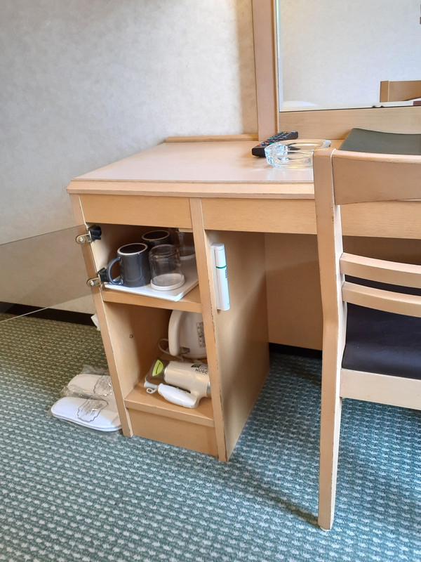 客室にはアメニティ(歯ブラシ、化粧水、コーヒー、お茶など)は一切置いてなく、ロビーから持って行く仕組みです。
