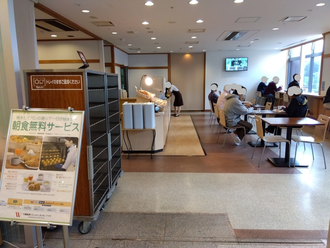 無料の朝食は6時半から10時までです。オレンジジュース、野菜と果汁のミックスジュース、飲むヨーグルト、スープ(コーン、ビーフコンソメ、クリームチャウダー)、焼きたてパン4種類、味付半熟ゆで玉子のバイキングです。なかでもバターロールが美味しかったです。6時半過ぎ頃は混んでいたようです。1 / 10