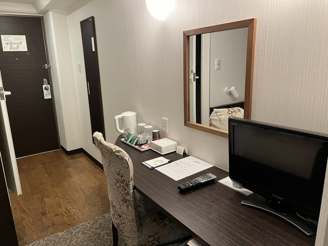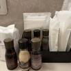 アメニティは冷蔵庫に水、コーヒードリップ、綿棒コットン、ポーラの小瓶シャンプーなどなかなか良い。1 / 8