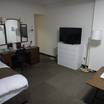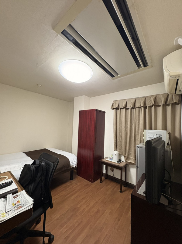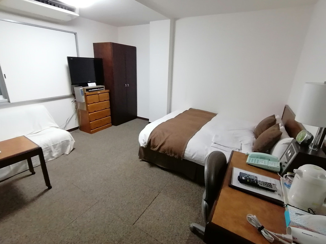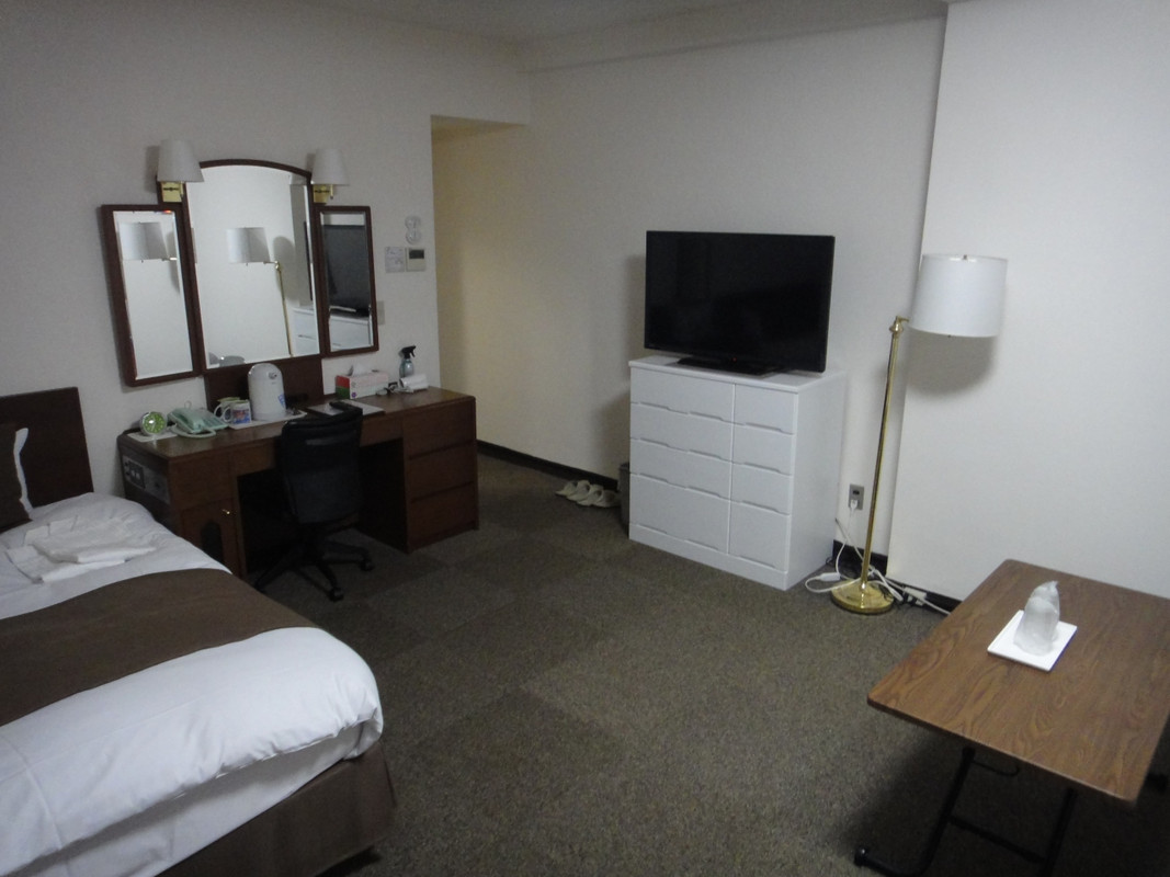 かなり昭和感が漂うホテル。部屋は広くベッドにデスク、応接セット、普通サイズの冷蔵庫、クローゼット用のタンスもある。