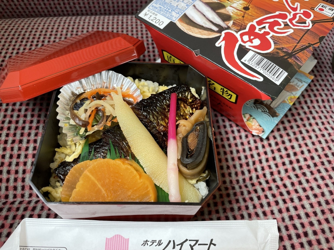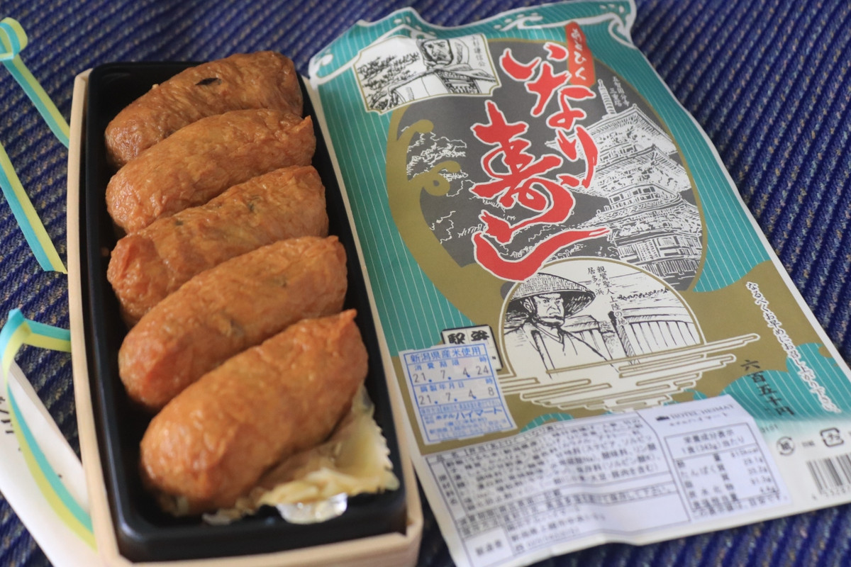 直江津駅前、ホテルハイマートの駅弁です。いなりずしはハイマートの前身「山崎屋」の名物だったそうです。信越線の関山~直江津開業125周年を記念して復刻された駅弁です。小腹を満たすのにちょうどいい感じす。