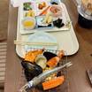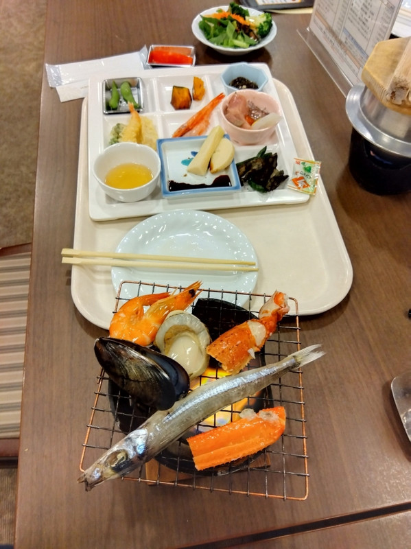 夕食のバイキングは数種類のお刺身と山菜の天婦羅、握り寿司の他に、半加熱済みの魚介類、釜飯やうどんなどを、旅館でよくあるコンロと固形燃料を使って卓上で自分で調理するのが楽しかったです。