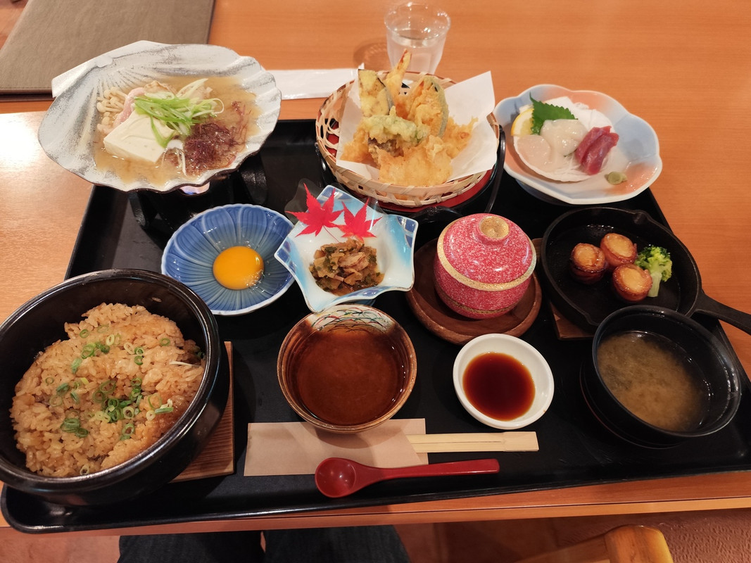 近くにお店が無くても困るので夕食を付けておいた。「ホタテ尽くし御膳」。ホタテの刺身、ホタテの天ぷら、ホタテの貝味噌焼き、ホタテのバター焼き、ホタテご飯。小食の私は半分食べた時点でお腹いっぱい。十分すぎる量だった。1 / 3