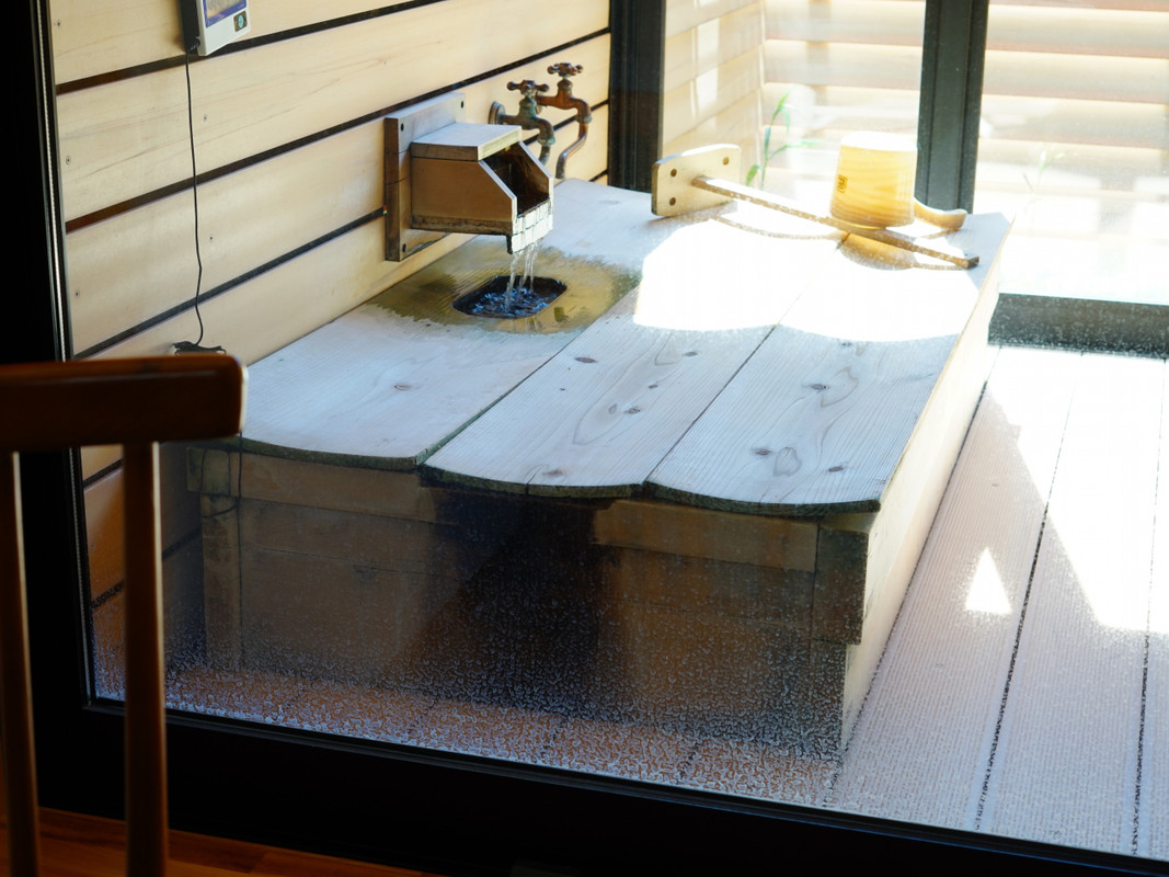 足湯入浴をしたり、浴槽サイドでまったりして、3時ごろになってやっとお湯が浴槽に溜まりました。