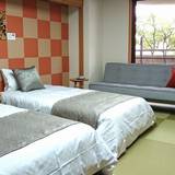 温泉旅館には少ない和室に低めのベッドを入れた部屋は、使い勝手がよく、団体旅行なら4人が入るところを2つのシングルベッドが置かれるなどゆとりある配置である。