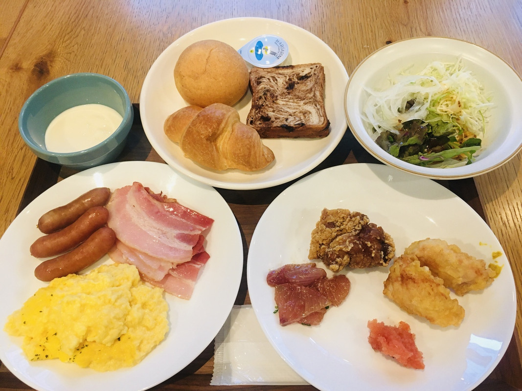 朝食はバイキングスタイルで、大分名物の鳥天や唐揚げ、りゅうきゅうなどが揃っていました。
