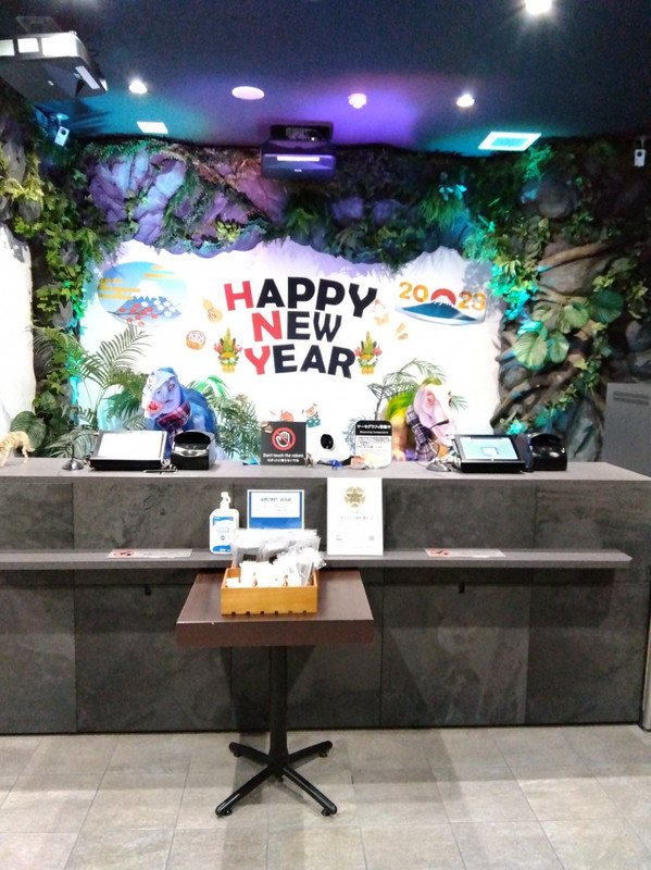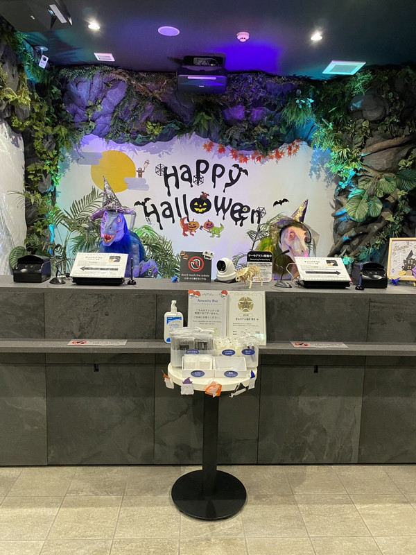 旅行割りだとか、機械の利用方法だとかで、毎回社員の方が呼び出されて、説明の為に、出たり入ったりしており、あまりフロントの恐竜の意味がない(逆に邪魔な状態)気が…