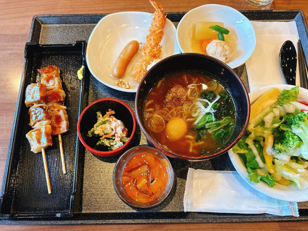 朝食は室蘭名物のカレーラーメンや焼き鳥(という名の豚)もあったりして、よかったです。1 / 3