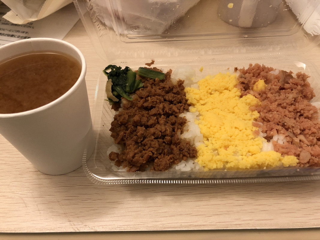 コロナ禍だったので朝ご飯がしょぼいそぼろ弁当だったので小食付けなければよかったと思いました。1 / 2
