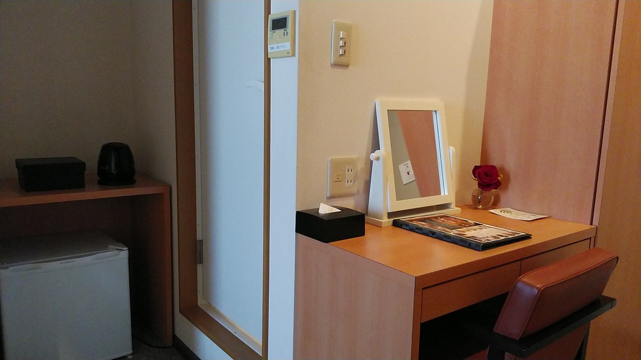 部屋内に置かれていたテーブルをシャワーブースの扉を開けて中に置き(シャワーは使用しなかったので)、そこを歯磨きセットやドライヤー、ブラシ置き場にしました(大浴場が混んでいたので、髪は部屋で乾かしました)。