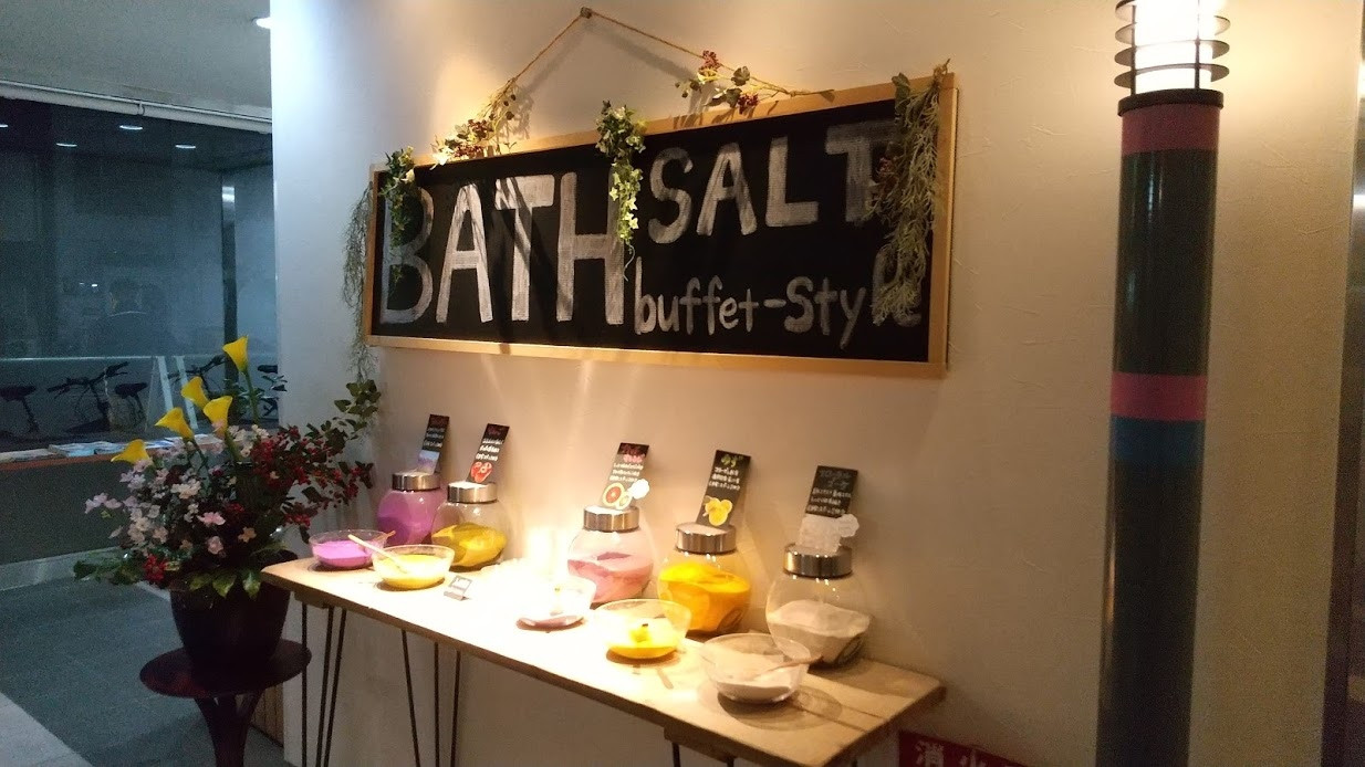 入口でバスソルトを自由に持ち帰ることができ、部屋で使えます。
