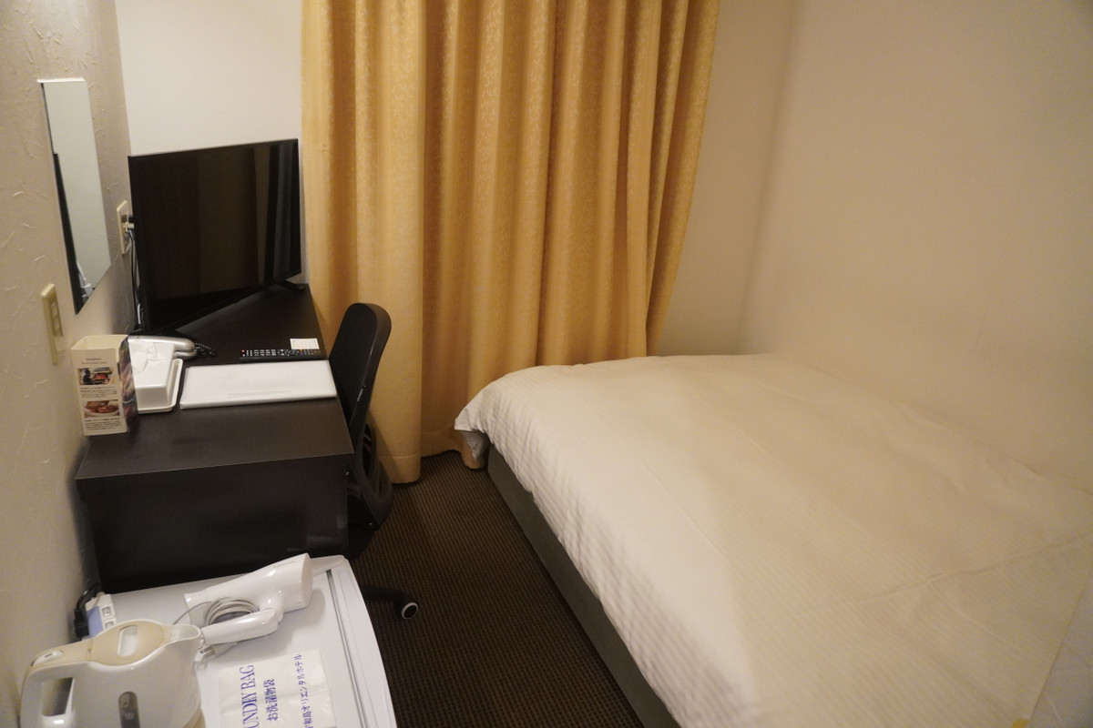 宇和島オリエンタルホテルは、宇和島駅からは少し離れていてそれなりに歩きますが、これならまあまあ許容範囲かな。建物はしっかりしているし、スタッフがたくさんいて皆さん若いですね。サービス精神旺盛というか明るいので、チェックイン手続きをする辺りから、なんか元気をもらったような気がしました。客室はミニマムですが、シンプルで居心地は悪くないです。