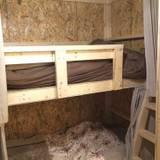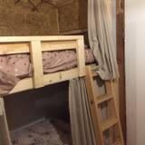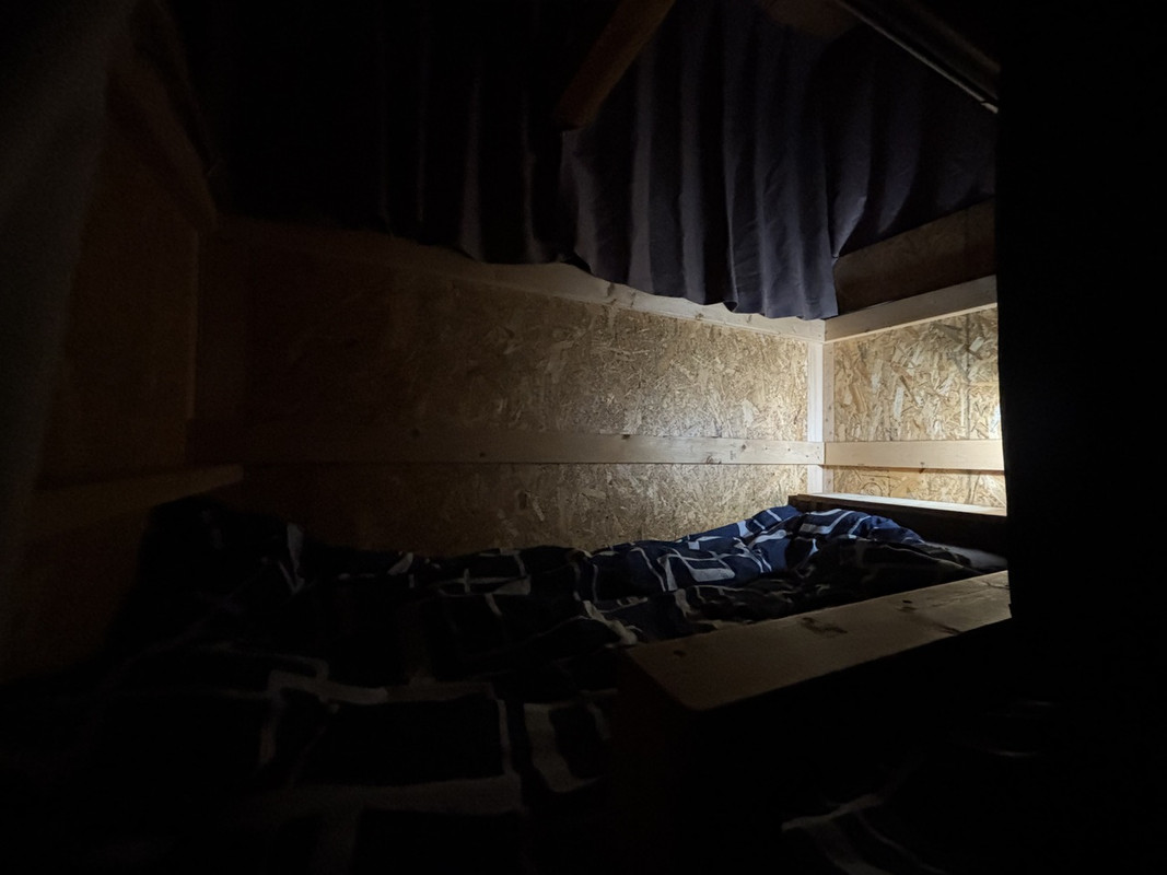 狭い寝床に無理やり物置棚を設置しているので、背の高い(恐らく175㎝以上)人は、足を伸ばして寝れない。