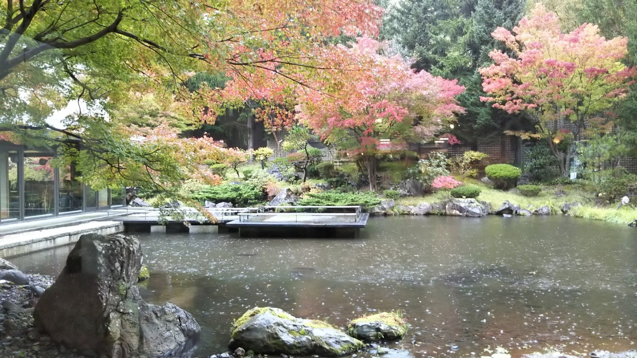 出発前に、ロビーにフリードリンクがあり、庭を眺めながら楽しむことができました。1 / 2