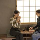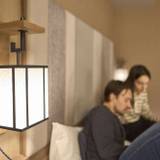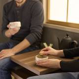 テーブルと一体化したソファの代わりになるものは座椅子風で、日本情緒を感じさせるように考えられている。