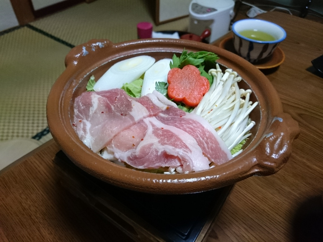 夜は、突出し、こんにゃく入りの刺身、酢の物、煮物、焼魚、鍋といろいろあります。地ビールの四万ビール(瓶)が500円ですが、これは温泉街の酒屋で買っても450円するので、旅館でこの値段で飲めるのはとてもお得です。1 / 4
