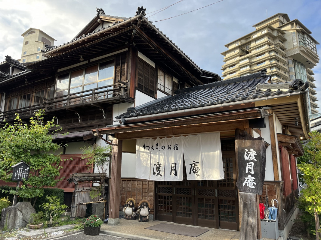 2食付きで一泊しました。渡月橋のすぐ近くにある宿で、部屋からは正面に渡月橋が見えました。建物は、大正4年に建てられたもので全体的にレトロな雰囲気です。和倉温泉最古の数寄屋造建造物だそうです。