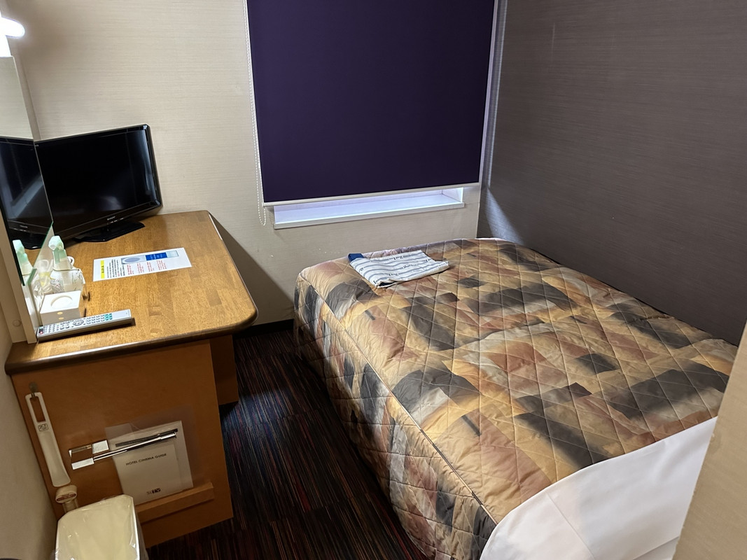シングルといってもセミダブルになるのでベッド自体は少し広めですが、部屋自体が狭いので結果的にベッドで占有されてしまって窮屈になり、非常に狭さを感じます。広さをまったく気にしない人向けではあると思います。あとはシャワーだけで湯舟はないので、そこも織り込み済みでないといけない点には要注意です。立地も駅から多少歩きますが、ここらへんのエリアではほぼ最安値にはなると思うので、あくまでコストパフォーマンスを気にする人向けのホテルといえると思います。