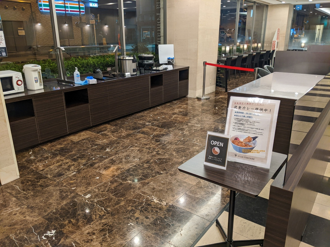 仕事の関係で大手町に宿泊することになり調べると・・・ 素泊まりで5千円以下で安定のヴィラフォンテーヌが。即予約。当日、ホテルに着くと、素泊まりですがサービスでカレーライスが限定30名に。しっかりいただき・・・ 翌朝はセルフお茶漬けのサービス。結局、軽くですが2食付でした(笑) 部屋もしっかり手入れされていて、十分。ちょっと驚いたのは、ホテルの部屋の前の廊下が屋外。普通のマンションみたいでした。でも、静かな環境で問題なし。たまたまお安かったのか・・・もう少し高くても次回も使いますね。良い宿泊が出来ました。
