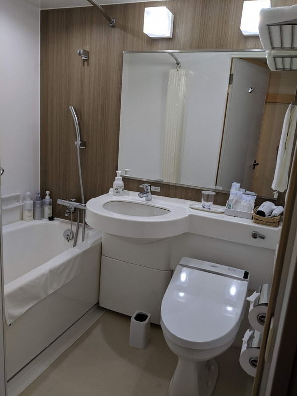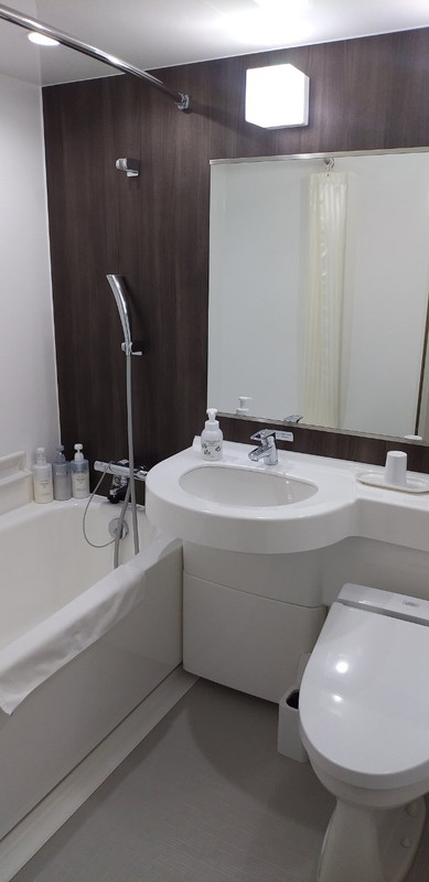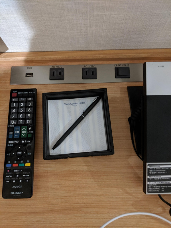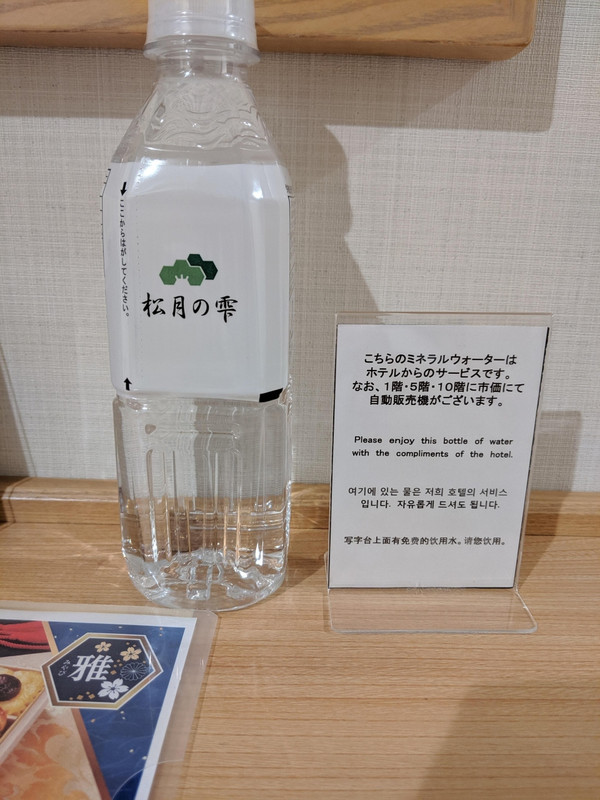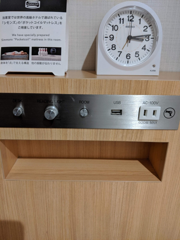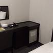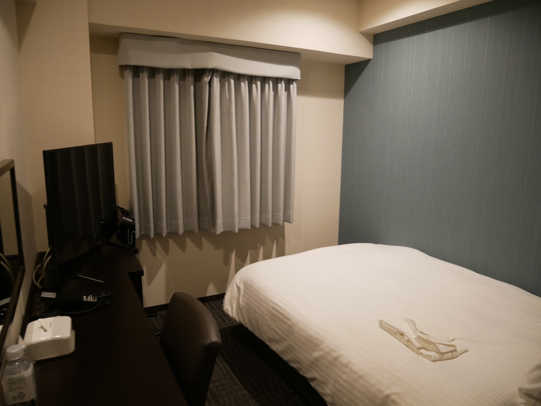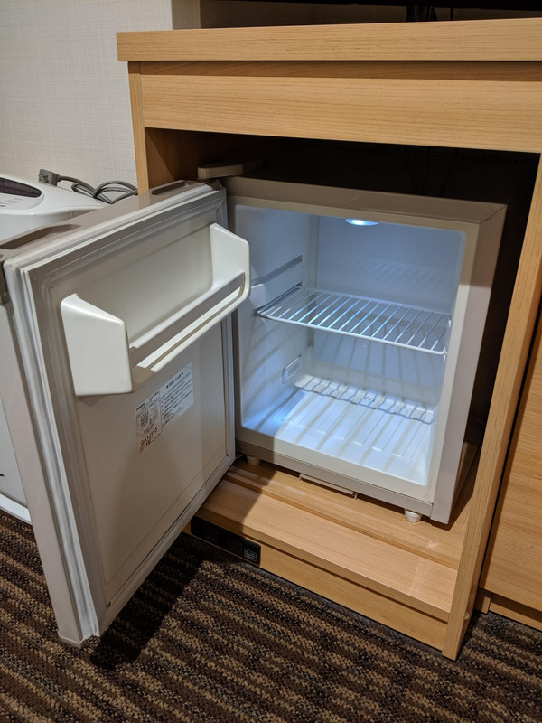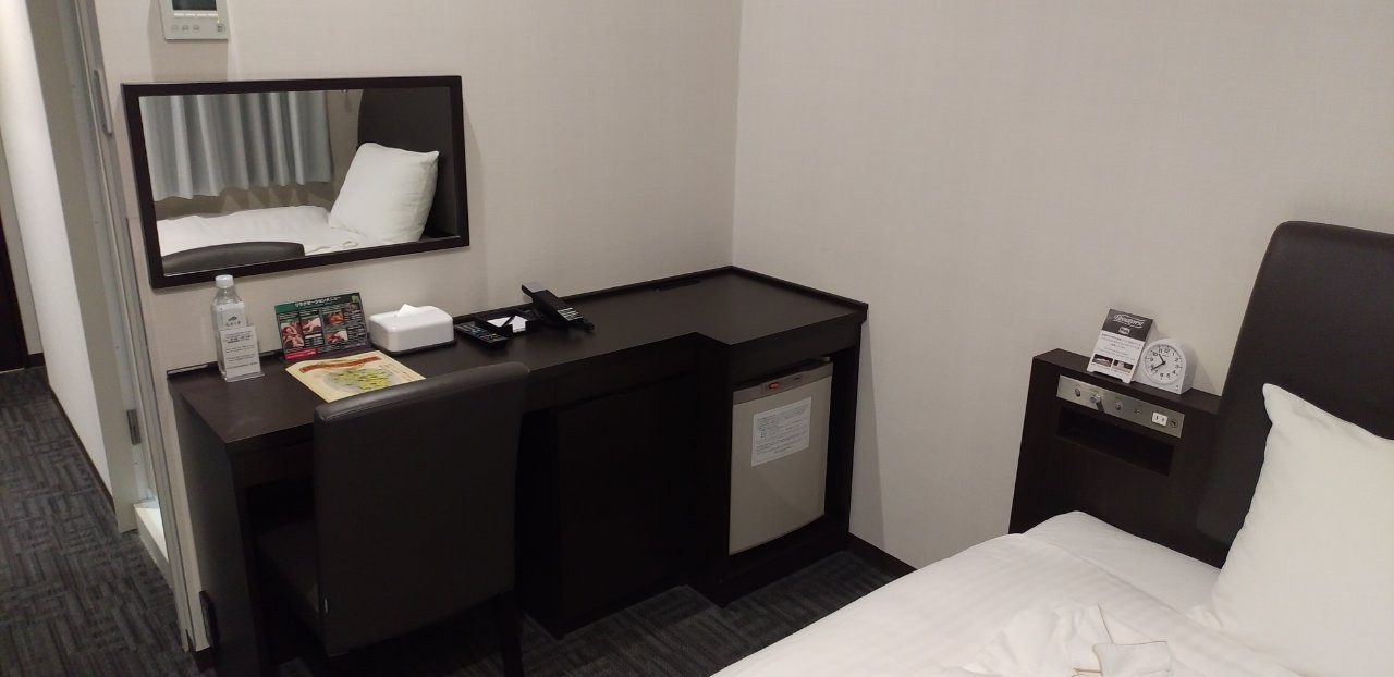 テーブルとベッドサイド、それぞれコンセントやUSBが使用できるようになっており、目覚まし時計や無料のミネラルウォーターもあります。冷蔵庫もよく冷えます。備え付けの消臭スプレーが清水香だったことも嬉しいです。焼鳥屋やもつ鍋などで衣類についた臭いを取るのに市販のどのスプレーよりもこれが効くので、これが置いてあるのは好印象です。実は自宅にも業務用ではないけど同じものを常備しています。