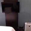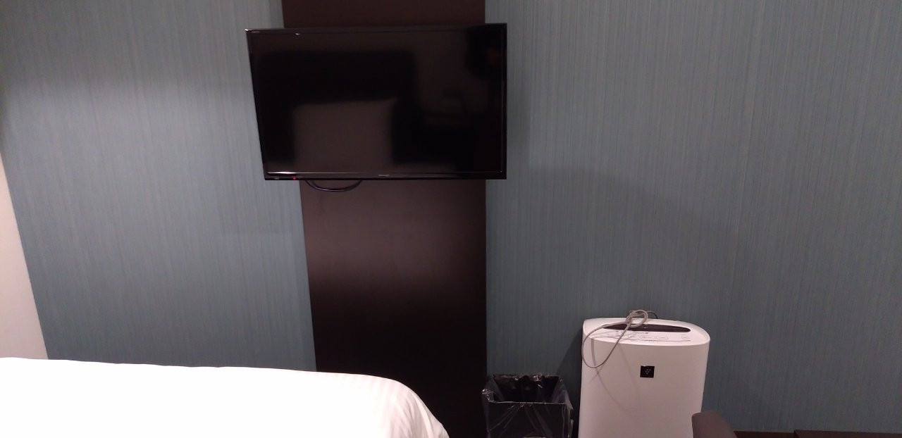 部屋にはミネラルウォーターがサービスで置いてあります。テレビは壁掛けスタイルです。ベッドに寝た状態で正面にあるので見やすいですが見ながら寝てしまいそうです。